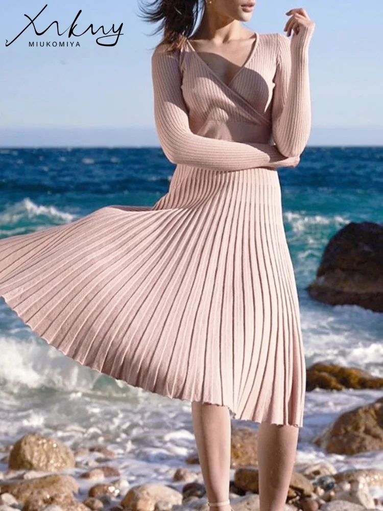 Long Autumn Winter Dresses For Women 2022 Elegant Knitted Pleated Dress V Neck Office Ladies Chic Women Dresses Winter 2022